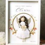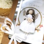 Elegancki zestaw prezentowy na Chrzest Święty z ramką pamiątkową z ręcznie robionym przez Nas aniołkiem z makramy i pudełkiem na banknoty.